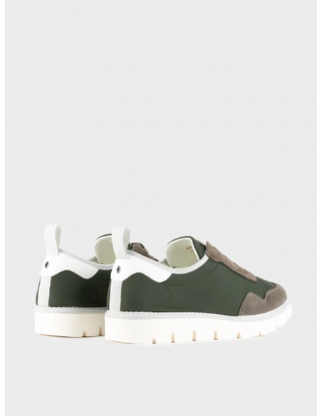 Sneakers Slip On P05 realizados con inspiración running y confeccionados en nailon verde militar, inserciones de ante tono sobre tono y cordones elásticos efecto brillante. El forro de estos playeros esta realizado microfibra lo que asegura la perfecta transpiración, además cuentan con plantilla antibacteriana de microfibra extraíble.