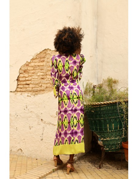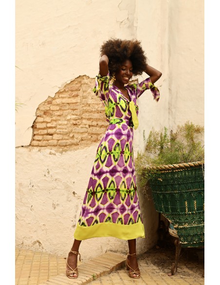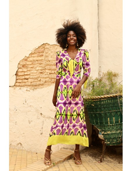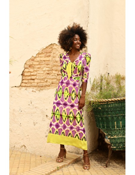 El vestido largo con nudo en el escote es una elección elegante que se adapta a tus preferencias. El nudo ajustable permite personalizar el escote según tus gustos, agregando un toque de versatilidad a la prenda. Las mangas francesas con lazos al final añaden un detalle encantador y femenino, mientras que el cierre con cremallera invisible en la espalda asegura un ajuste impecable.
