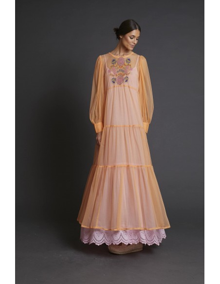 Este vestido de tul es una verdadera obra de arte con su manga abullonada y su pechera bordada en punto cruz. La manga abullonada añade un toque de dramatismo y elegancia, mientras que la pechera bordada en punto cruz aporta un detalle intricado y delicado. El forro interior acabado en puntilla no solo proporciona comodidad, sino que también añade un toque de sofisticación y refinamiento al conjunto. Con este vestido, estarás lista para deslumbrar en cualquier evento especial con tu estilo único y exquisito.