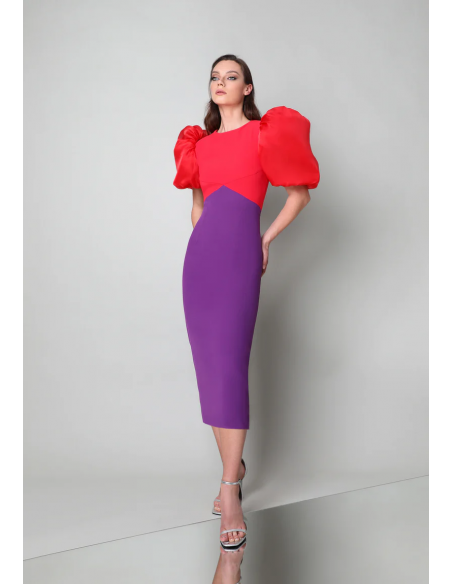 El vestido bicolor está confeccionado en crepé, con mangas cortas abullonadas en organza de seda. Presenta un elegante escote a la caja y cortes diagonales en el cuerpo, que añaden un toque de estilo y modernidad. La falda es recta y de longitud midi, creando una silueta sofisticada y femenina.
