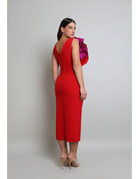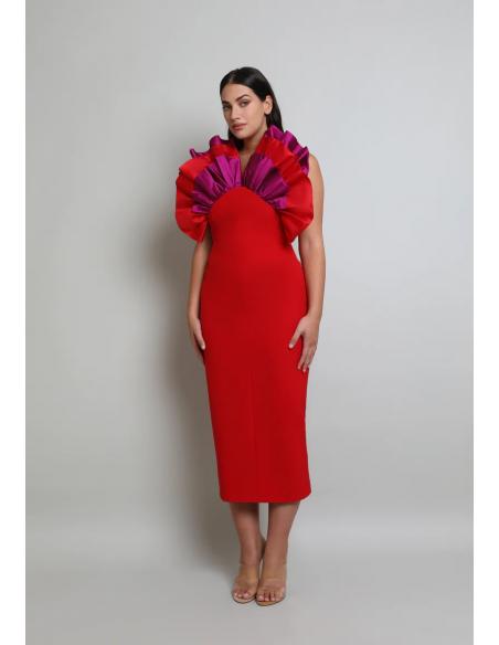 La falda de longitud midi agrega un toque de estilo clásico y femenino, mientras que los volantes en tafeta aportan movimiento y dinamismo al diseño. El vestido está confeccionado en crepé de alta calidad, lo que le brinda una apariencia lujosa y una caída suave.