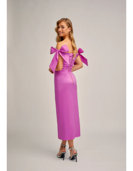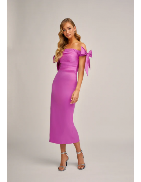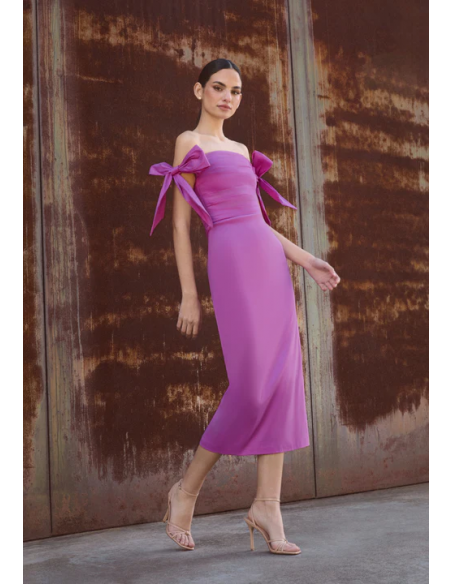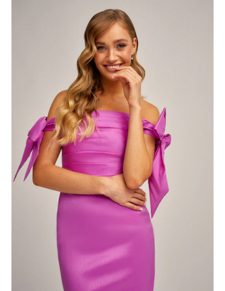 Su cuerpo drapeado resalta la figura con un acabado refinado, mientras que las lazadas envolventes en los brazos crean un efecto de manga sofisticado y distintivo. El corte en la cintura estiliza la silueta, complementado con una falda recta que aporta equilibrio y elegancia al diseño.