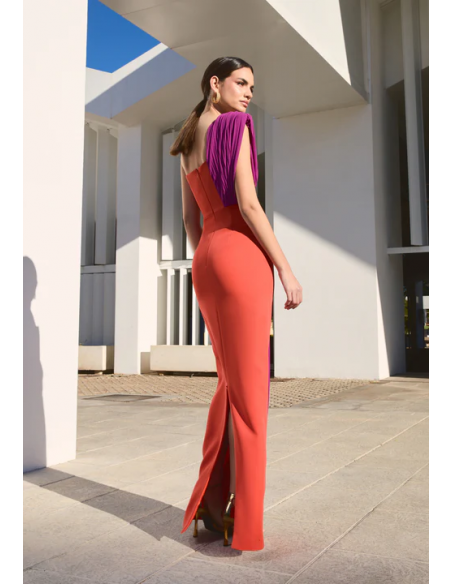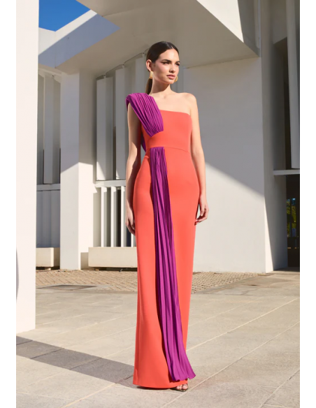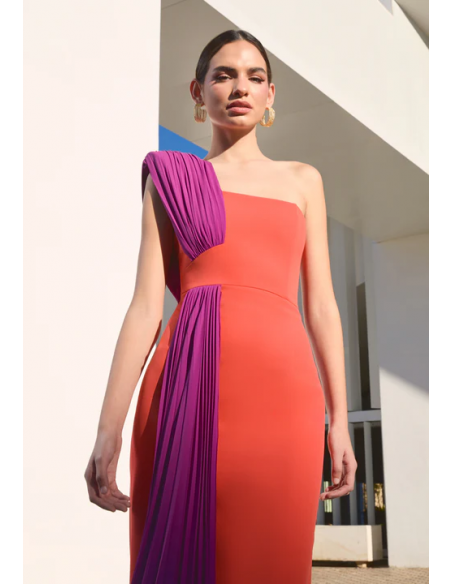 El Vestido Caledonia de Victoria es una pieza de elegancia moderna y estructurada. Confeccionado en crepé de alta calidad, su diseño largo asimétrico crea un efecto estilizado y único. El escote tipo palabra de honor está complementado con un plisado de georgette que cubre el hombro marcado, aportando un toque de sofisticación.