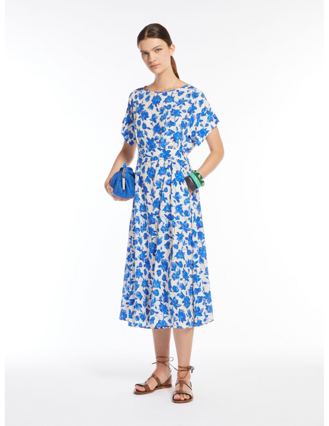 Vestido midi de corte holgado confeccionado en lujosa seda crêpe de Chine con estampado integral. De cuello barco y mangas cortas, incluye bolsillos laterales y cinturón a juego para marcar la silueta. No lleva forro, ideal para un look ligero y elegante.