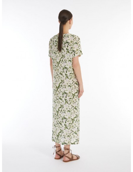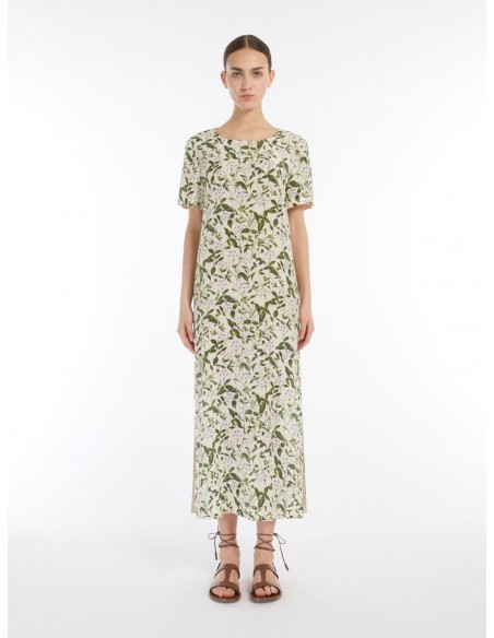 Vestido largo y fluido confeccionado en seda pura estampada. Presenta escote redondo, mangas cortas, aberturas laterales y cierre de lágrima con botón en la nuca. Un diseño sofisticado, sin forro, perfecto para un look elegante y cómodo.