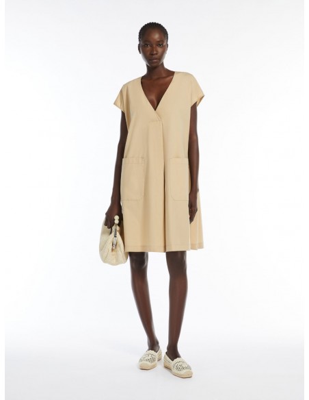 Vestido corto sin mangas de popelina de algodón, con silueta amplia y plisado central en el frente y la espalda. Presenta escote cruzado en V, bolsillos de parche y aberturas laterales. Incluye cinturón para ajustar la cintura y estilizar la figura.