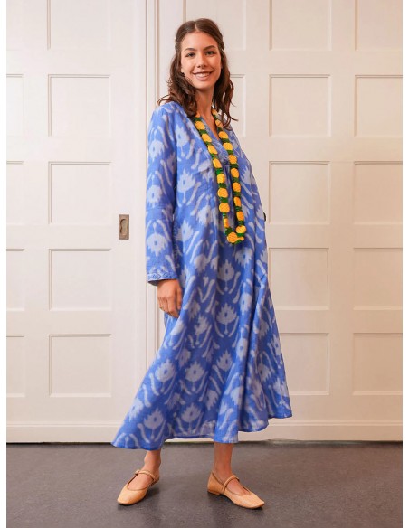 El Sandalwood Dress Ikat Blue de Nimo With Love es un vestido túnica largo que transmite una estética veraniega libre y elegante. Confeccionado en 100% lino natural, su tejido se vuelve más suave con cada lavado. Su silueta oversize en línea A puede llevarse suelta para un efecto fluido o ceñirse con un cinturón a la cintura para realzar la figura. Presenta un profundo escote en V, mangas largas y estilizadas con puños bordados que añaden un toque artesanal. El diseño se completa con bolsillos laterales ocultos y largo hasta el tobillo (127 cm en talla S). Ideal para los días cálidos o para un look relajado con sofisticación natural.