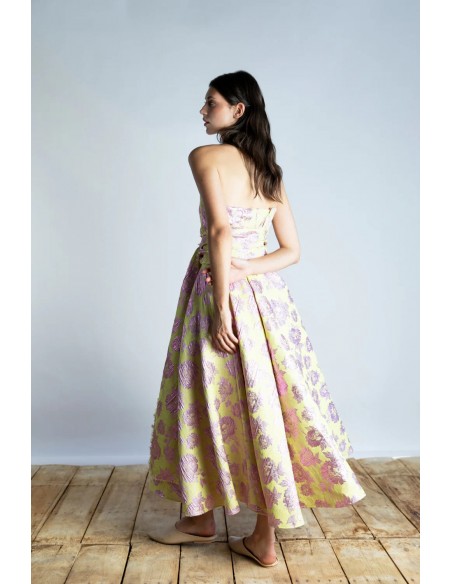 El Vestido Strapless with Pleated de Psophía es una oda a la elegancia atemporal con un toque moderno. Este vestido sin mangas, con escote palabra de honor, realza los hombros y el cuello, aportando un aire sofisticado y femenino.