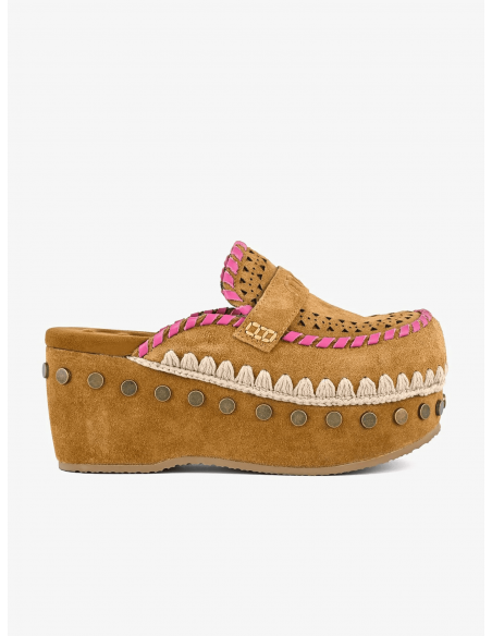 Confeccionado artesanalmente en ante de alta calidad, este zueco destaca por las características costuras de ganchillo de la marca y los detalles de tachuelas metálicas que aportan un toque desenfadado y contemporáneo.