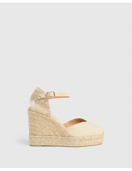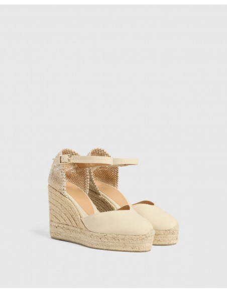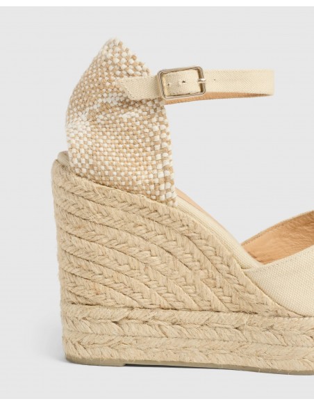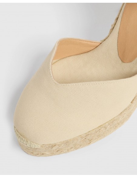 Modelo representativo de la firma Castañer, las alpargatas Chiarita combinan diseño clásico y sofisticación mediterránea. Confeccionadas artesanalmente en España en algodón orgánico natural, presentan una puntera cerrada redondeada, cierre lateral con hebilla metálica y una doble plataforma que estiliza sin sacrificar la comodidad. La cuña de yute alcanza los 11 cm de altura (8 cm de cuña + 3 cm de plataforma), y su suela es de caucho vulcanizado para un agarre firme. Ideales para elevar cualquier look con estilo y tradición.