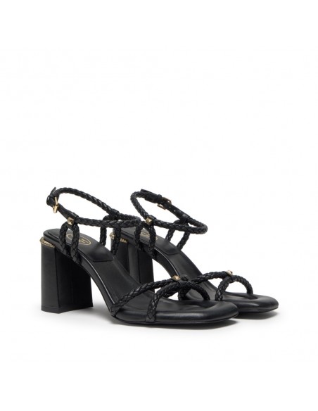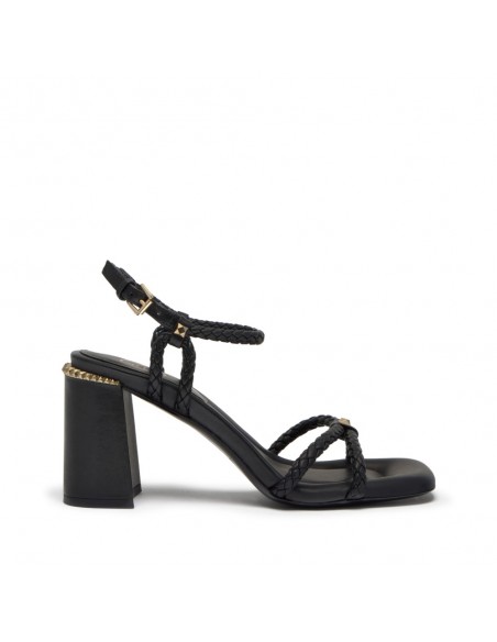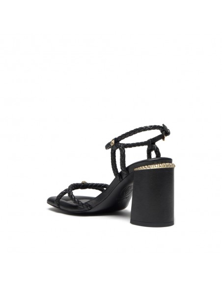 La sandalia Lola Bis de ASH destaca por su elegancia atemporal y su carácter sofisticado. Confeccionada en piel Soft Brasil negra, presenta un diseño sobrio y refinado que se realza con un accesorio dorado Ariel Gold que aporta un toque distintivo y lujoso.