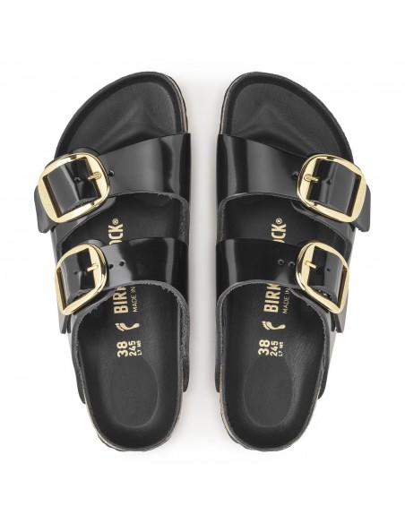 Birkenstock Arizona Big Buckle High Shine Black reinventan el icónico modelo de dos tiras con un toque sofisticado. Esta versión luce una elegante piel natural con revestimiento esmaltado tipo charol que aporta brillo sin perder las propiedades transpirables y adaptativas de la piel. Las hebillas metálicas de gran tamaño aportan carácter y permiten un ajuste individualizado. La plantilla semi-exquisite anatómica de corcho y látex está completamente forrada en piel Piumato, ofreciendo una pisada suave y confortable. La suela exterior de EVA ligera y flexible garantiza amortiguación y resistencia. Perfectas para quienes buscan estilo atemporal con un acabado lujoso y brillante.