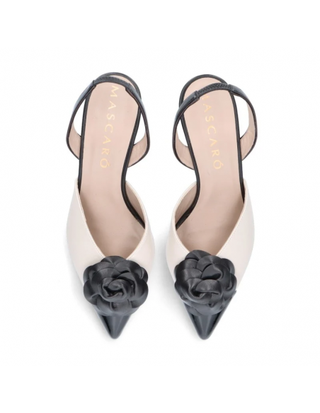 Sandalias de napa color marfil con puntera de charol negro y flor en napa negra hecha a mano. Realizadas en salón destalonado de punta fina en, suela de goma, plantilla y forro de piel.