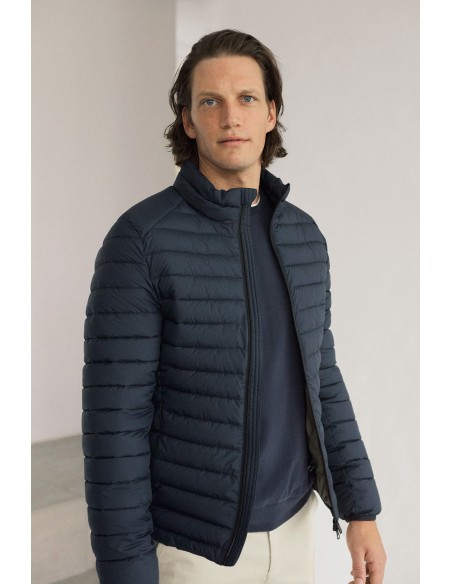 El abrigo Beret, con cuello alto y acolchado está hecho 100% con poliéster reciclado de botellas de plástico recicladas.